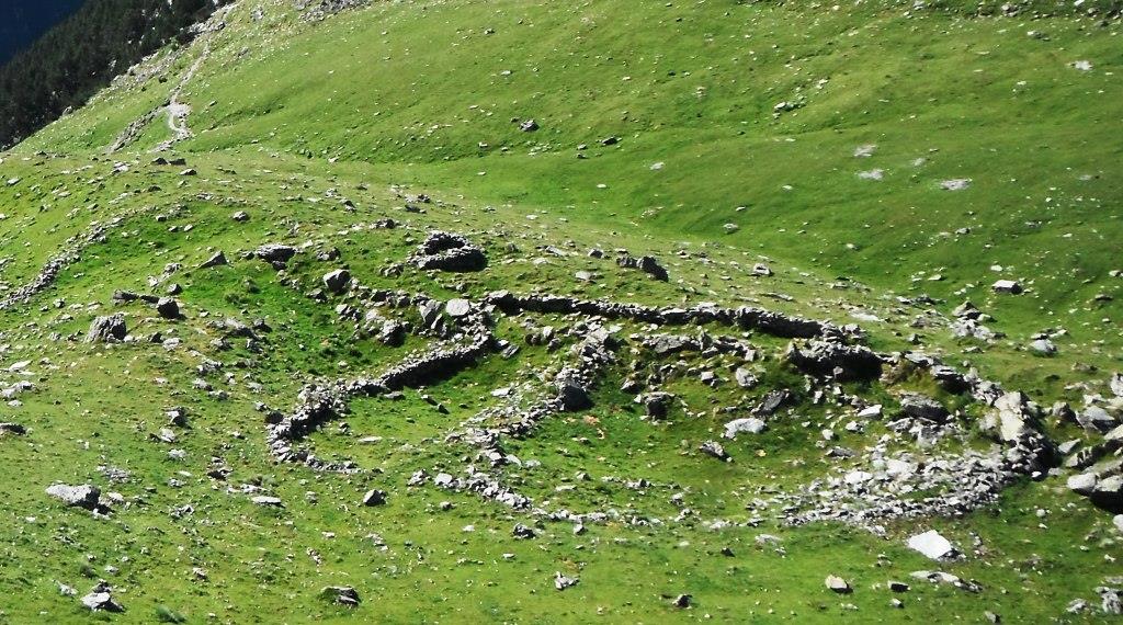 El que es veu a la fotografia és una pleta d’uns cinquanta metres de llarg amb un corredor per munyir el bestiar i les restes d’una barraca de planta rodona enfonsada. A sota, a tocar del camí, hi ha la cabana de Gombrèn, de planta circular i sostre de falsa volta, cobert de gleva. Fa gairebé cinc metres de diàmetre i a l’interior hi ha tres fornícules. La porta, orientada a l’est, és força baixa, i els murs amples.