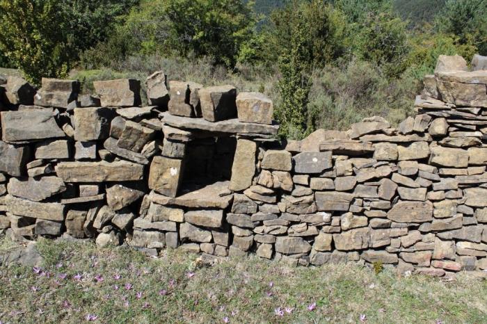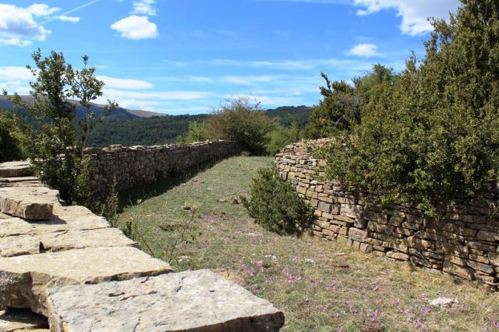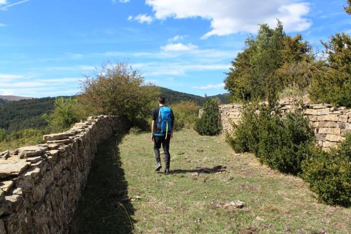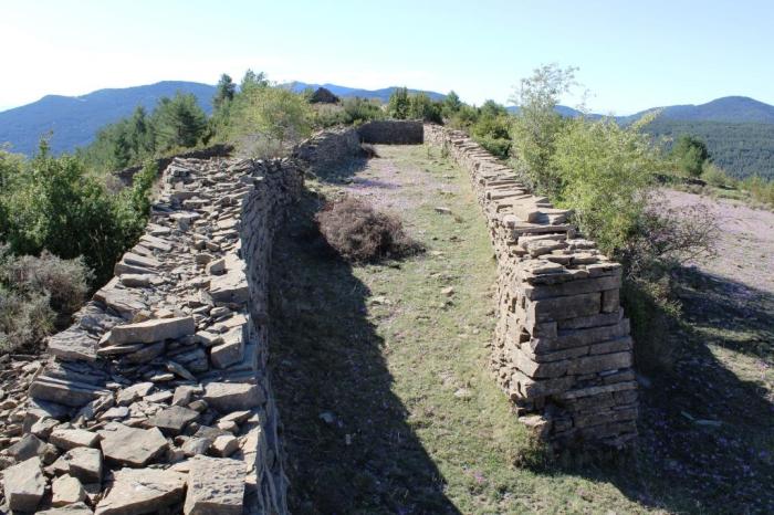 Els d’Escartín “Consisten en grandes cercas de piedra, muros levantados sin ningún tipo de argamasa –piedra seca– y de gran grosor, con la forma de una U alargada y con unas medidas aproximadas de 30/40 metros de largo por 4/5 de ancho, a excepción del sito en la punta del cerro, más redondeado para acoplarse al terreno.”