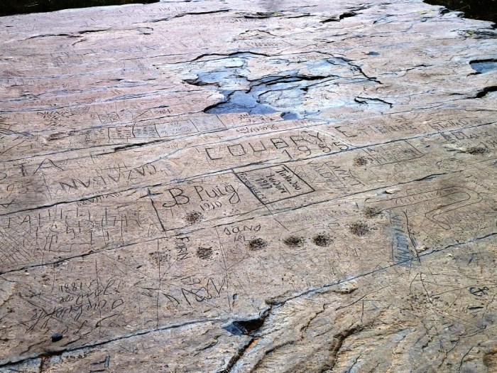 La pedra es plena de gravats i inscripcions amb un passat més que mil·lenari. Hi hauria d’haver una sèrie de representacions antropomorfes, segurament altmedievals, una mena de màscara molt més antiga i moltes coses que no són fàcils de datar. Però costen molt de veure (si és que encara hi són, perquè algú es va emportar un tros de pedra a casa seva).