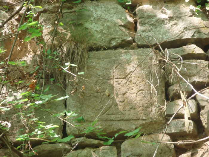 Es tracta de petits grafits, almenys una desena, que es troben en algunes de les pedres dels nivells inferiors. Són dibuixos de caire religiós, entre els quals destaquen les creus (hi ha qui també hi ha vist motius vegetals, triangles, crismons, semicercles, lletres etc., però nosaltres no tenim tanta imaginació).
