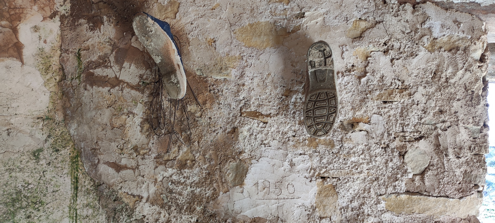 Com es veu, es tracta de dues sabates desaparellades penjades dins d’una cabana, on figura clarament inscrit a la paret l’any 1950. Quin significat tenien?, si és que en tenien algun…