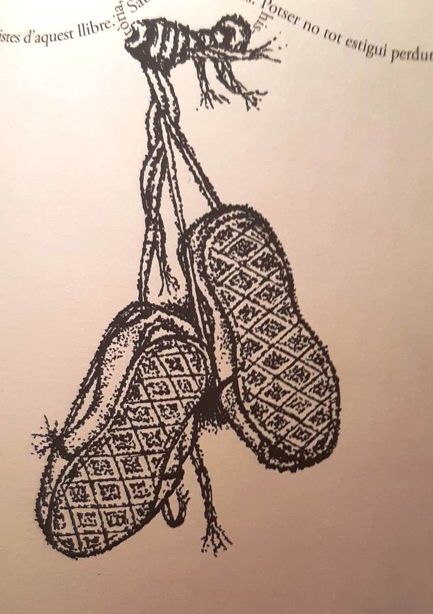 Un bon amic m’acaba de dir que hi ha un cas documentat en què una persona es protegia de les bruixes deixant les seves espardenyes penjades a la porta de casa. Ho ha tret d’un llibre sobre els pobles abandonats, on trobem aquesta imatge i un peu de foto que diu “Aquestes espardenyes eren d’en Siset Costa d’Albons. Les tenia penjades a la porta per allunyar les bruixes i els mals esperits“.
