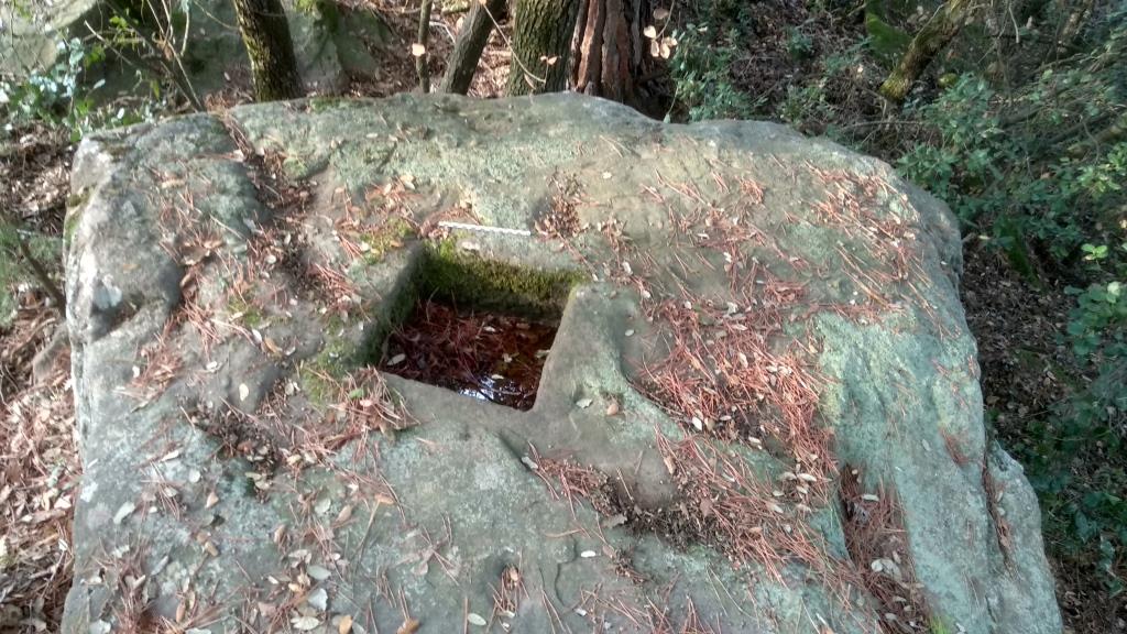 Es tracta d’un forat gairebé quadrat, de 35 cm x 38 cm i 17 cm de profunditat, que no sembla ser massa antic, excavat en un bloc de pedra sorrenca i que es troba en el punt 41º 46’ 224 – 002º 15’ 810 – 539, al costat d’un gran dipòsit d’aigua i en un petit serradet.