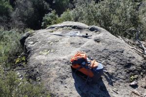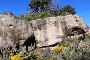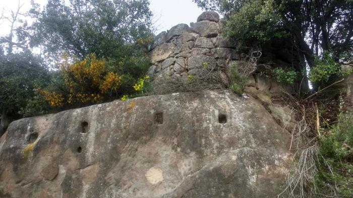 El més interessant, però és escassos metres per sobre, just a la paret del cingle, on apareixen alguns encaixos molt desgastats, segurament d’algun edifici.