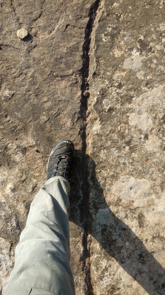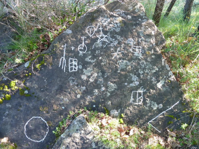 A part d’aquest gravat, en una antiga pedrera que es troba més al sud, apareixen altres petits grafits (segurament la pedrera se’n va carregar més d’un). En destaco un que semblaria un calvari, amb tres creus (la tercera molt poc perfilada). Si fossin calvaris, no costa adonar-se que els crucificats tenen els peus separats, fet que em sembla que correspon a les talles romàniques, però no ha a les gòtiques. Potser això ens podria servir de pista cronològica, juntament amb el fet que Sant Esteve de Menaurí, ja documentat al segle X (font), no es troba massa lluny del lloc.