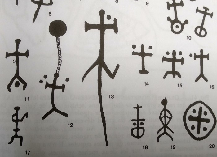 Algunes semblen creus, que acaben amb rodones o triangles, però hi ha una figura que sembla una creu sense el pal de dalt, que hauria estat substituïda per una rodona. Els extrems dels braços apareixen bifurcats, com si fossin mans; i el peu és doble. És possible que correspongui a una creu antropomorfa com les que descriu Jean Abélanet (i si no, ja ens ho fareu saber). S’ha de dir, però, que el cap (rodó) és força dubtós.