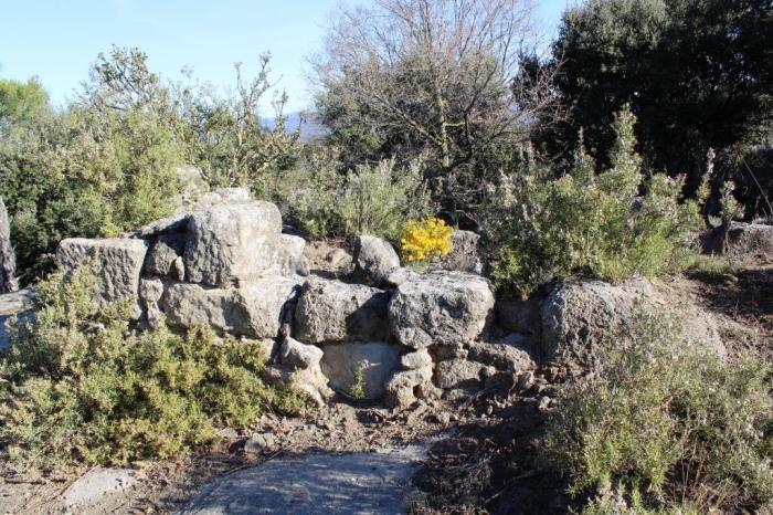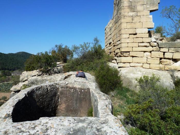 El que no recullen els germans Corominas són les restes d’un petit edifici que es trobava a escassos metres al nord de la tina: aprofitant l’espai que deixaven els blocs (3 x 2,20 m), i tallant quatre encaixos de bigues a la roca nord es va aconseguir cobrir una petita estança, orientada a ponent. Dues regates tallades a la pedra permetien allunyar l’aigua de l’interior de la tina. A la zona apareixen algunes escasses restes de teules.