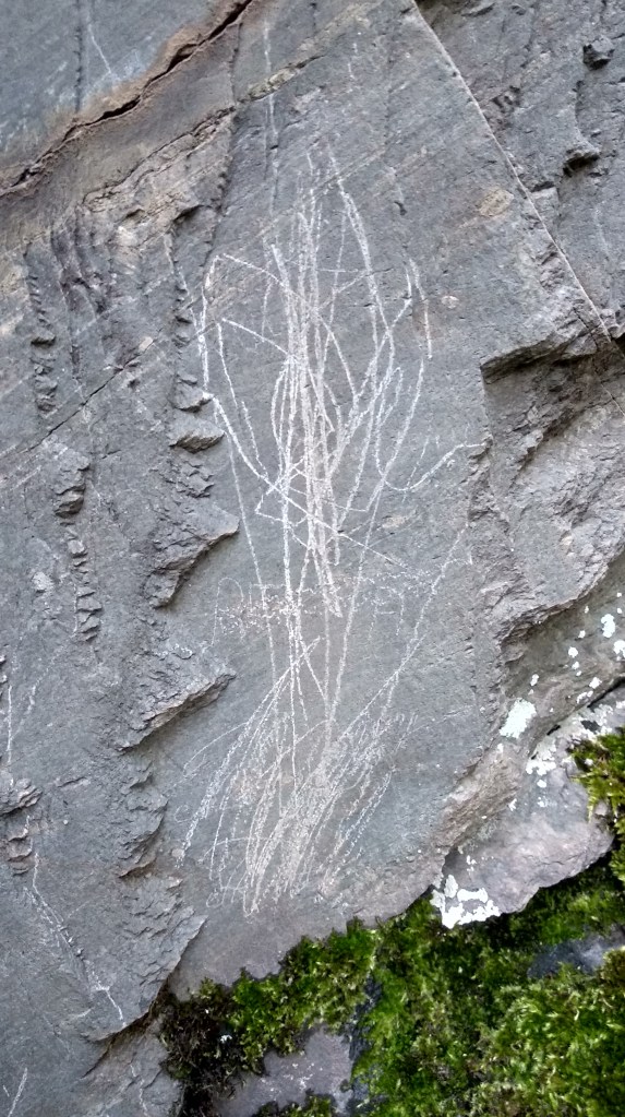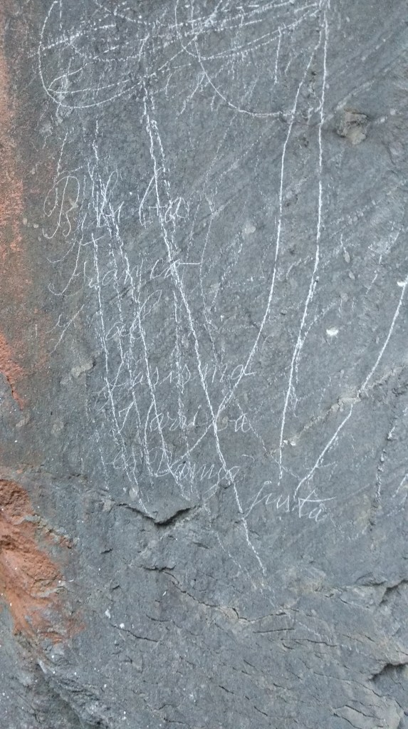 Això pel que fa a l’aflorament superior de la roca. A la part de sota, com el seu nom indica, hi ha una petita balma (vegeu això). Ja fa temps que se sap que a la part superior, al costat de les creus, hi ha alguns reguerons i cassoletes. Fa algun temps vaig descobrir un d’aquests reguerons més gran que els altres i que sembla posterior que presenta un canaló que conduïa el líquid que recollís (aigua?) cap a la paret.