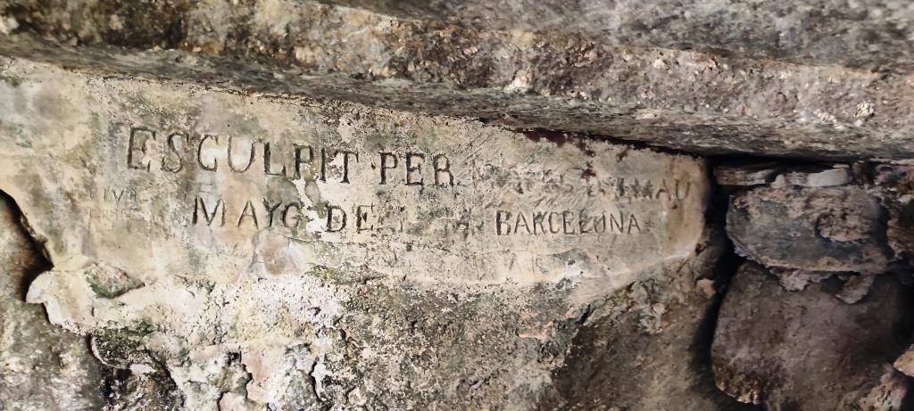 I, en segon lloc, trobem que encara hi ha dues inscripcions que ens recorden qui havia estat l’autor que havia esculpit alguna cosa en aquestes coves. En una d’elles hi llegim que l’obra havia estat esculpida el maig d’un any que es va esborrar, i en un lloc que diu que és Barcelona. Ara que ho sabem, s’endevina que la inscripció conté el nom del seu autor: Miquel Dalmau.