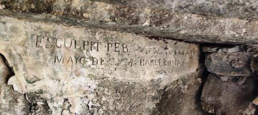 Per altra banda, en l’altra inscripció feta amb una pintura vermella, s’hi llegeix “Esculpit per Miquel Dalmau 1886” (hem tractat la imatge perquè resulti més fàcil de llegir).