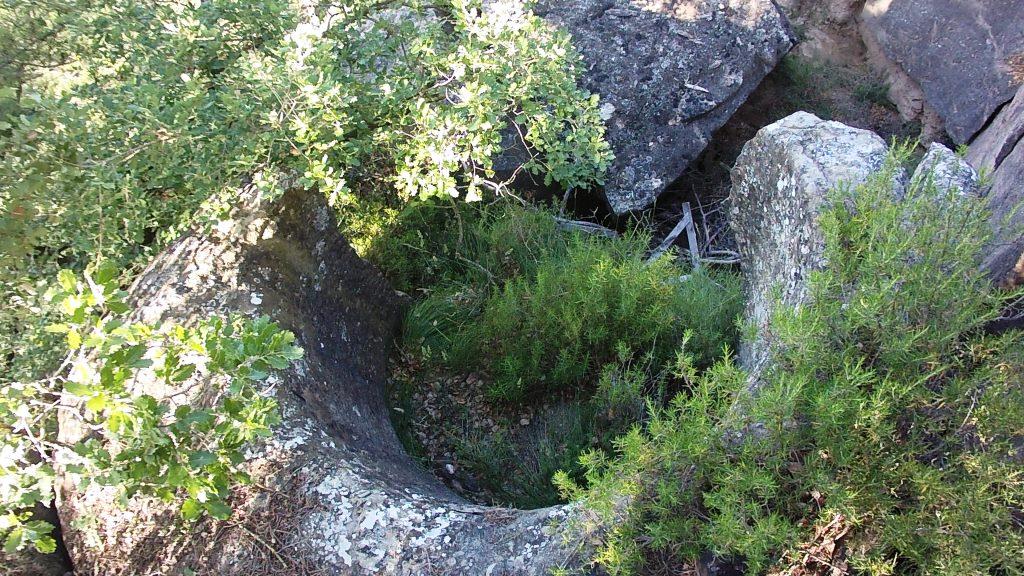 A les parets despreses que hi ha per sota, es troba una tina quadrada que també podria ser una sitja (125 x 70 x 60 cm), que sembla estar situada al costat d’una superfície de trepig o d’una base de premsa. En una altra pedra de les despreses també s’hi veu una base de premsa i altres encaixos i retalls a la roca indesxifrables. La hipòtesi és que sota el penya-segat hi podria haver hagut un mas, però no en queda cap rastre (si això fos cert, el cingle li hauria caigut a sobre).