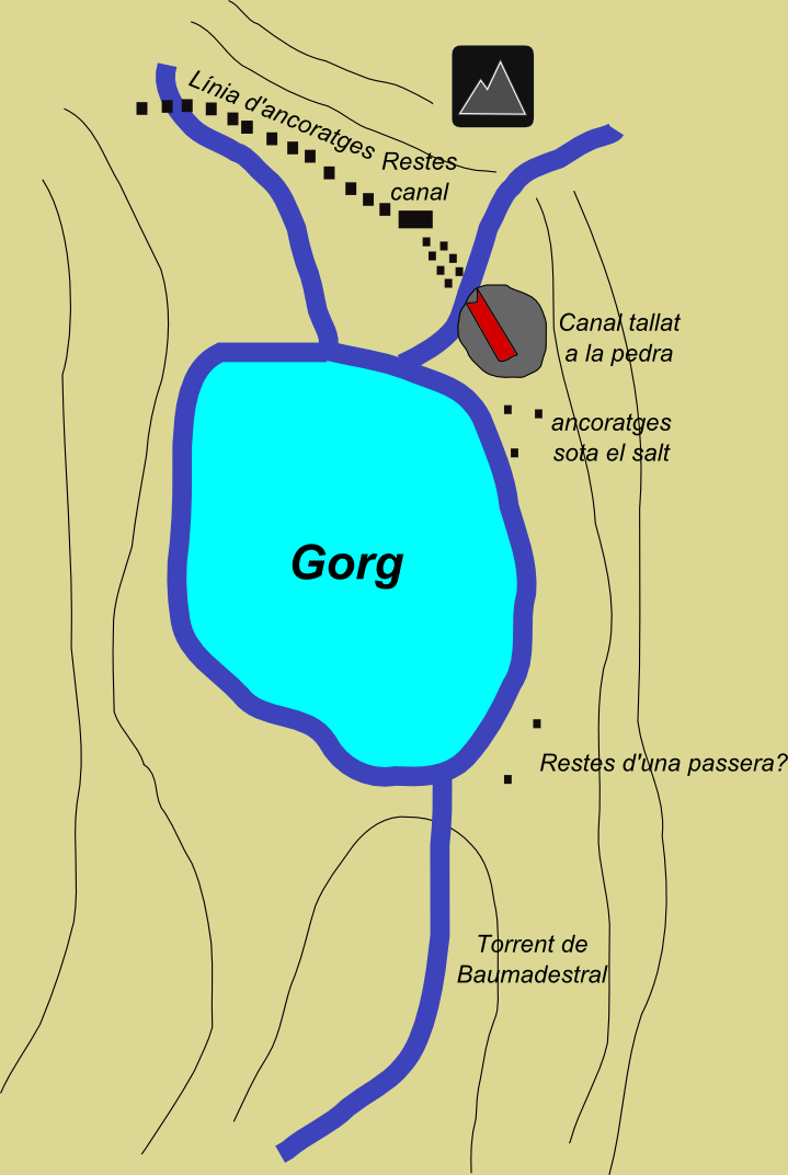 A sota del salt, a la riba de l’aigua, encara s’observen dos o tres forats excavats al terra, possiblement ancoratges per a la maquinària.