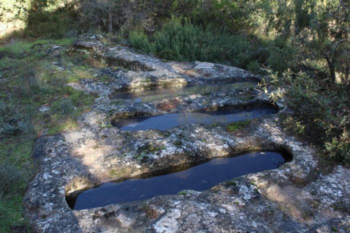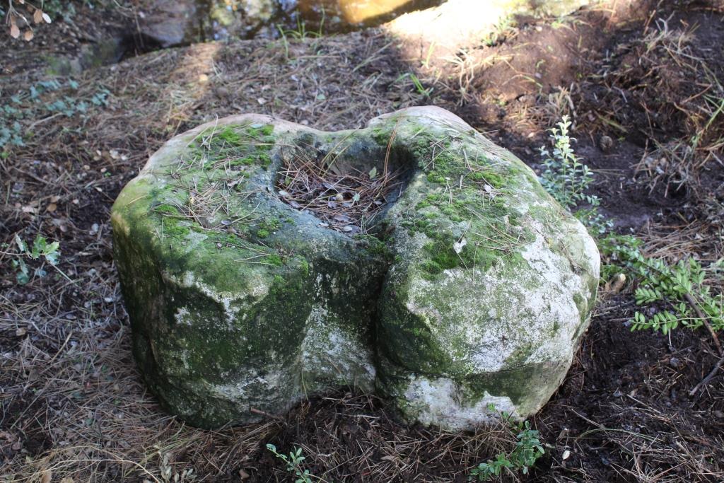 Tot fa pensar que les aigües que eren recollides a la part superior durant el episodis de pluja eren conduïts per aquest regueró (a dalt) fins a una possible pica que es trobaria en el lloc que indica la foto que teniu a l’esquerra del text (per cert, l’escala que es veu a les imatges fa 20 cm).
