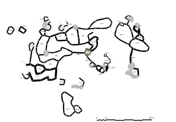 Planimetria del Despoblat de Casesnoves amb els codis dels recintes (Gassiot 2016c; Garcia Casas et al. 2015).