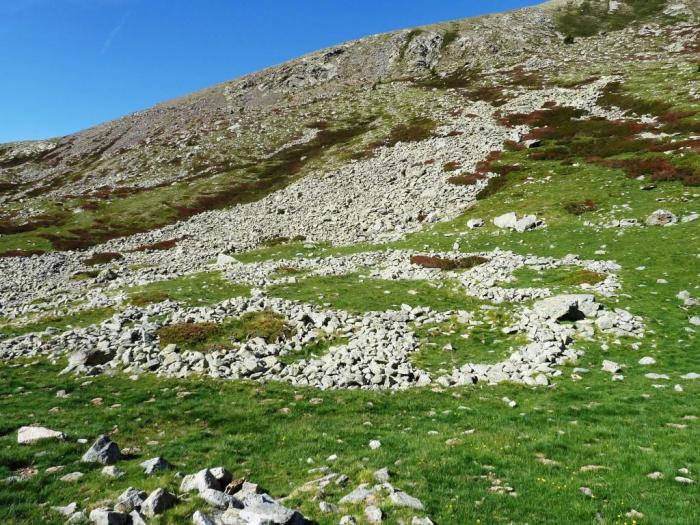 A pocs es troba una cabana construïda en pedra seca de forma rectangular amb una superfície d’uns 20 m² construïda amb grans blocs directament sobre el substrat morrènic.
