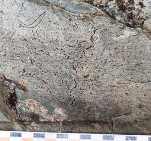 Una de les inscripcions, que està al costat d’aquestes marques, porta la data de 1948, i una altra mostra una gravat que a simple vista sembla una inscripció però que no sembla tenir sentit:
