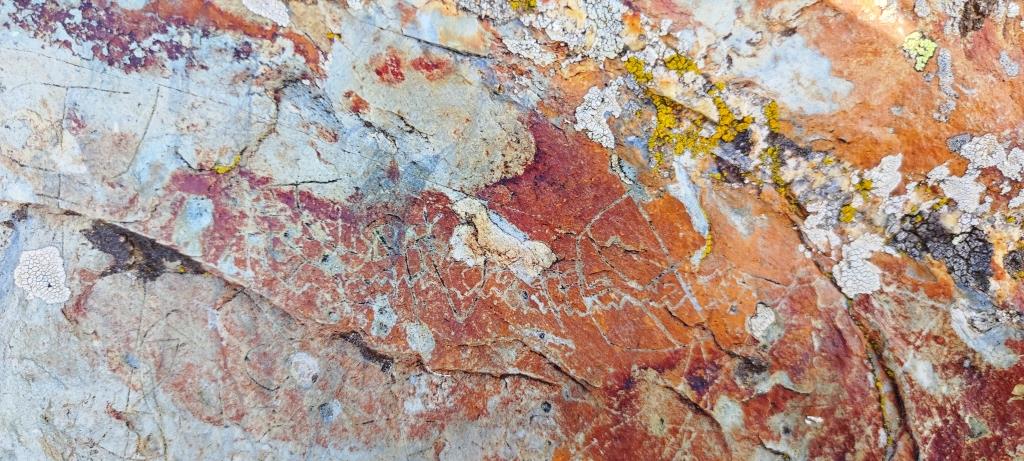 Més amunt trobem una altra pedra amb un gravat incís de tipus geomètric. Així, després de superar una forta pujada, arribem fins al turonet que l’ICGC anomena la Barraqueta i l’Alpina turó de Meianès. Aquí es troben diferents gravats, entre els quals destaquen tres possibles marques de bestiar: