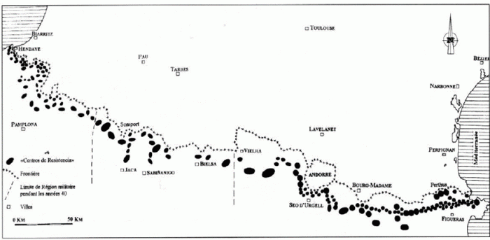 Si dic que no existeix una “línia P” és pel fet que no es pensava en un conjunt de defenses enllaçades entre elles, sinó que es creaven una sèrie de Centres de Resistència, que pretenien frenar l’avenç dels exèrcits enemics que pretenguessin penetrar al nostre país a través del Pirineu. El mapa de conjunt que ja fa anys varen fer Serrat i Blanchon dona una idea clara del que es tractava i del seu allunyament de la frontera: