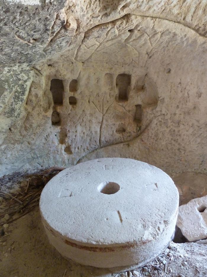 Just a sobre de la porta, per sobre d’unes regates que servien per desviar l’aigua que regalimava per la paret, es reconeix un espai rectangular tallat artificialment. Si hi pugem, amb compte, veurem que es tracta del pou del molí, que de seguida es transforma en un tub rodó d’uns sis o vuit metres de profunditat. Vigileu que no hi ha cap mena de barana ni de protecció.