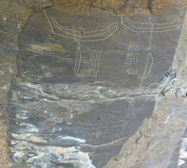 A part d’aquest gravat, en una antiga pedrera que es troba més al sud, apareixen altres petits grafits (segurament la pedrera se’n va carregar més d’un). En destaco un que semblaria un calvari, amb tres creus (la tercera molt poc perfilada). Si fossin calvaris, no costa adonar-se que els crucificats tenen els peus separats, fet que em sembla que correspon a les talles romàniques, però no ha a les gòtiques. Potser això ens podria servir de pista cronològica, juntament amb el fet que Sant Esteve de Menaurí, ja documentat al segle X (font), no es troba massa lluny del lloc.