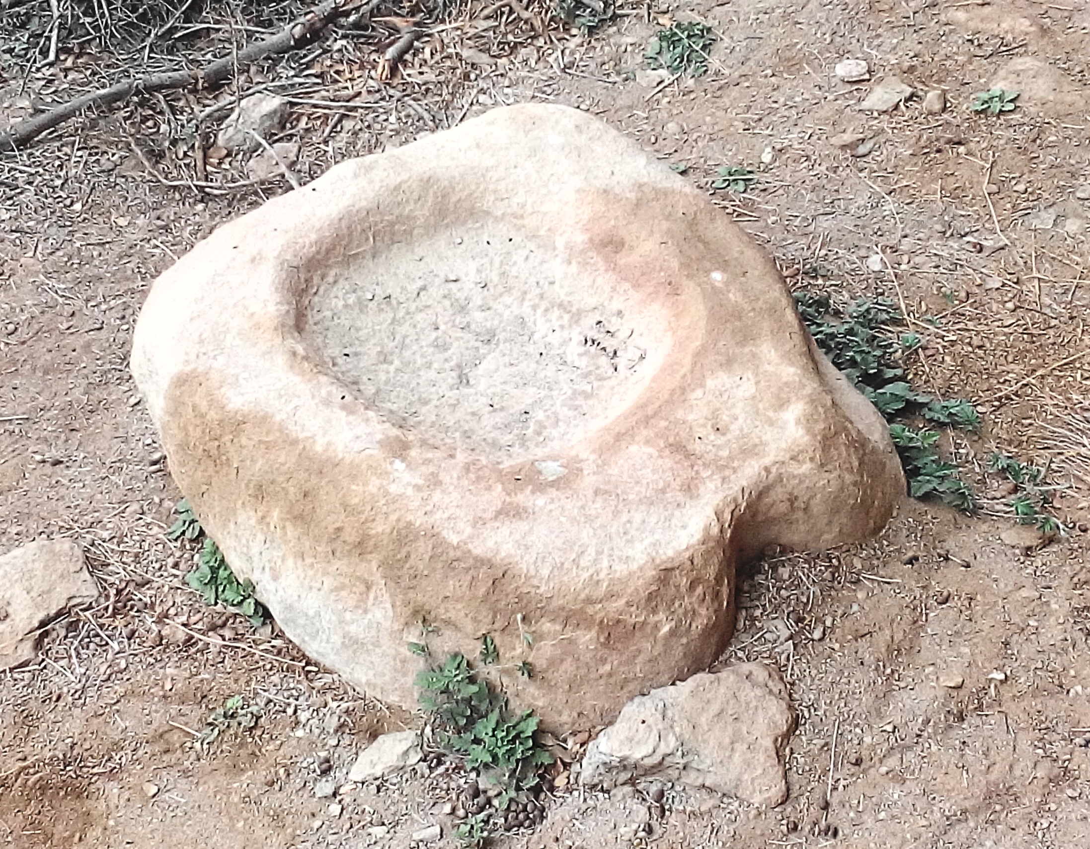 Es tracta d’un bloc de pedra sorrenca d’aproximadament 100 cm x 80 cm i uns 30 cm de gruix (mides molt aproximades), amb els dos encaixos en els extrems i el rebaix de la zona plana enfondit per ser utilitzar com a pica (segurament recollia l’aigua d’algun degotall de la mateixa paret).